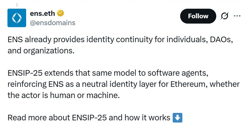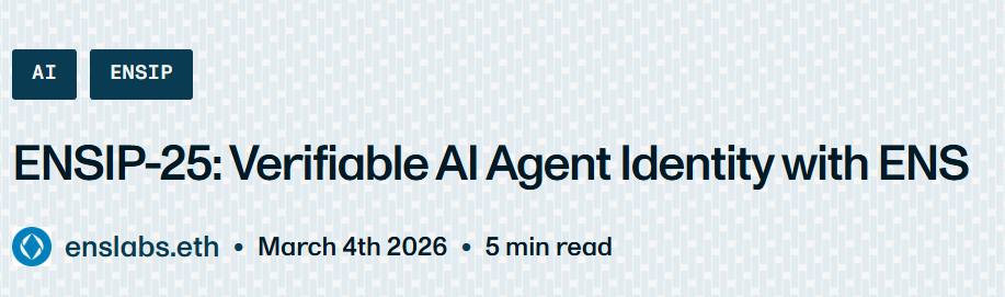 On March 5, ENS published ENSIP-25, a new standard that addresses exactly this. If an AI agent is registered in a system like ERC-8004 and claims an ENS name, the name owner can explicitly confirm that association by setting a standardized text record. Wallets, explorers, and frontends can then independently verify the link using a single resolver lookup. The design is deliberately minimal as ENS doesn't become the agent registry, just the identity bridge. Same thing it's always done for humans and DAOs, now extended to autonomous software.